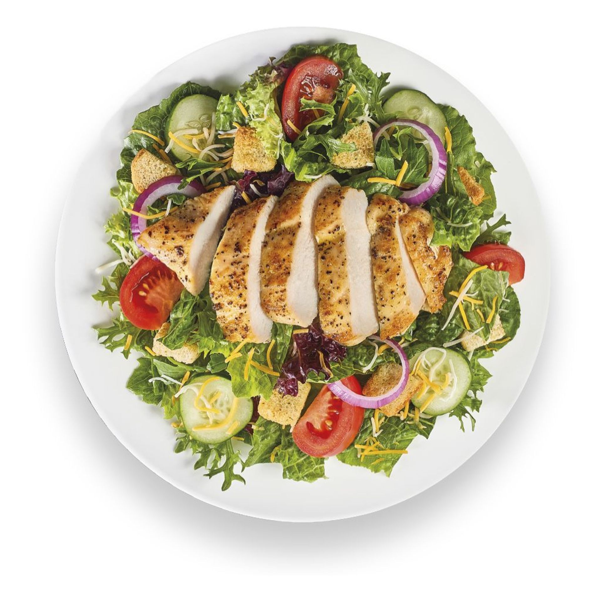 Pollo a la parrilla mezclado con tu salsa favorita, servido sobre una cama de lechuga fresca con tomate, pepinillos crujientes, zanahoria rallada, cebolla, mezcla de tres quesos, crotones y tu elección de aderezo ranch o blue cheese.