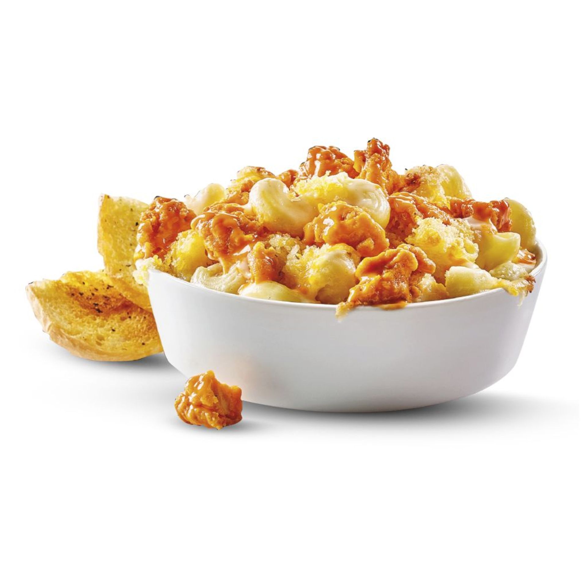 Boneless bañados en salsa medium sobre una cama de macarrones con una mezcla de tres quesos, blue cheese y crema. Acompañados con un pan brioche tostado.