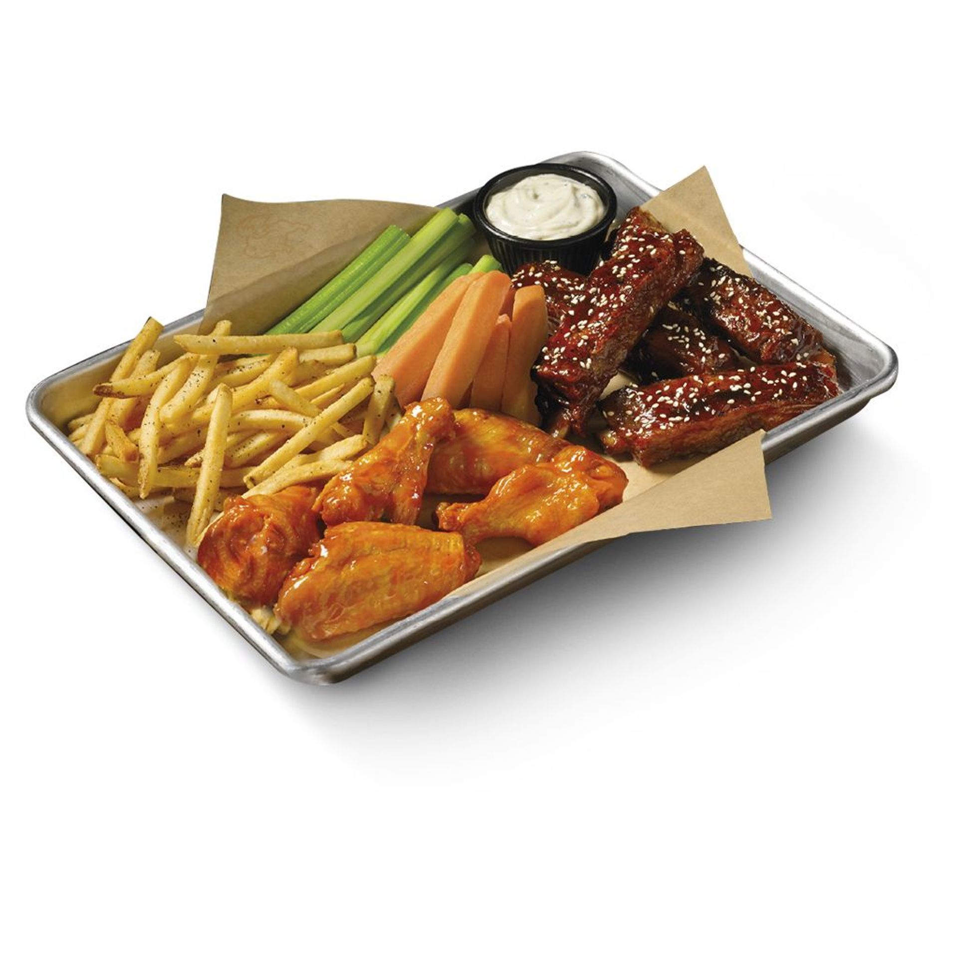 Costillas de cerdo al estilo St. Louis con nuestra salsa honey BBQ y tu elección de cinco alitas tradicionales bañadas en tu salsa o sazonador favorito. Acompañadas de papas a la francesa, apio y zanahoria.