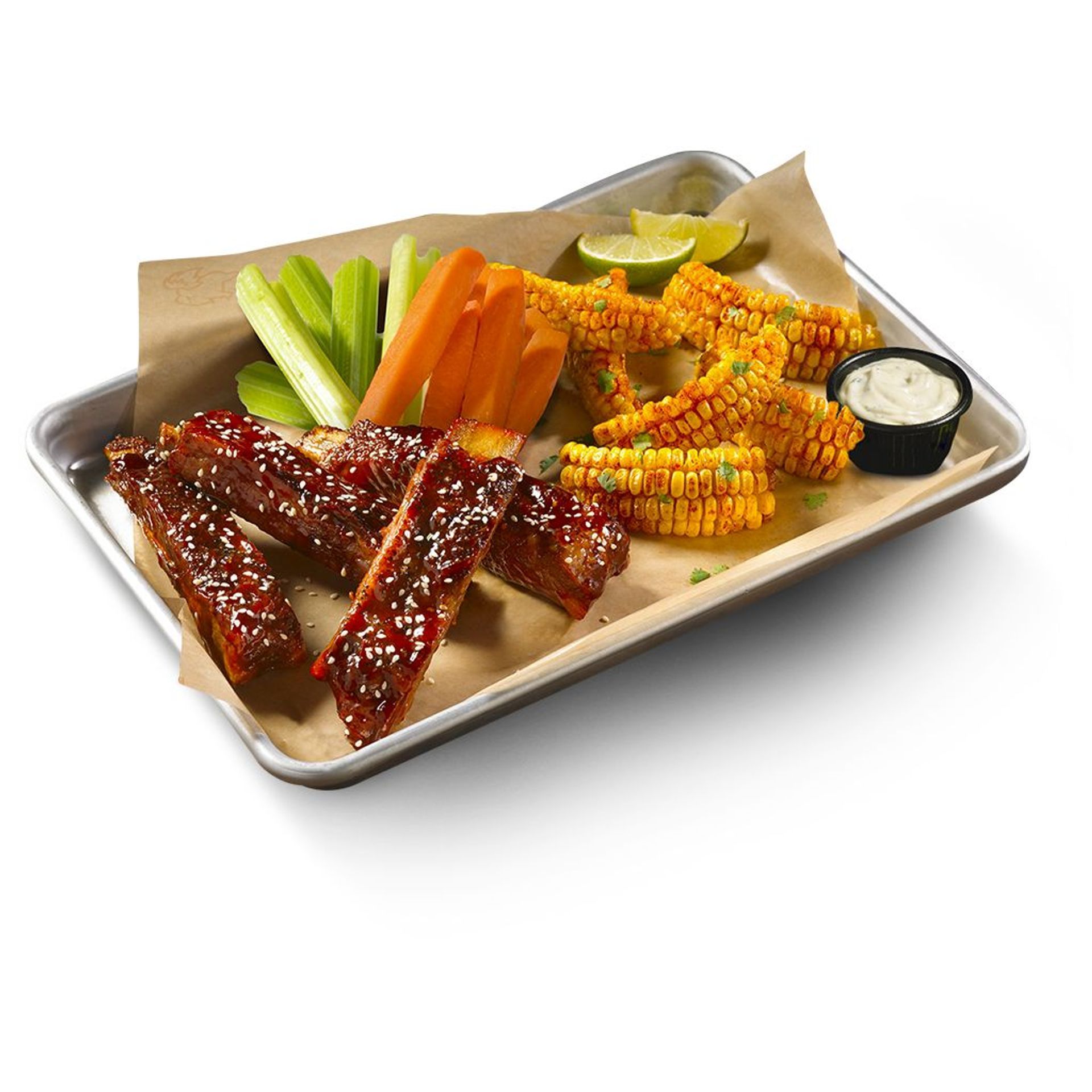 Cuatro costillas de cerdo al estilo St.Louis cocinadas a dos tiempos. Acompañadas de elote dulce sazonado con desert heat.